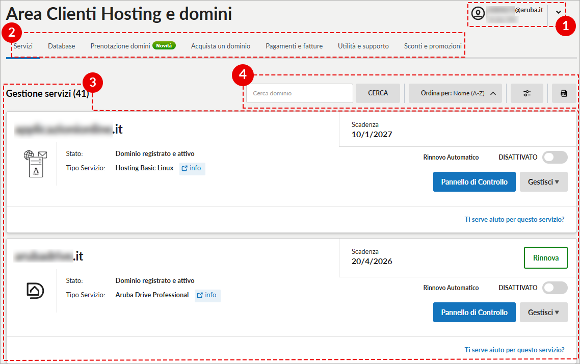 L'area clienti Hosting è formata da tre sezioni principali ed un'area di ricerca e ordinamento: