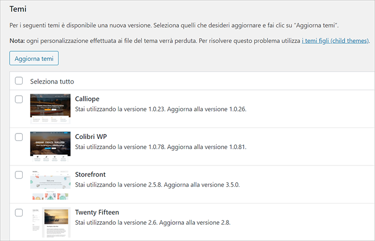 - vai su Seleziona tutto per aggiornare tutti i temi. Altrimenti, seleziona un tema alla volta e vai su Aggiorna temi. Leggi la guida per verificare la compatibilità dei temi con la tua versione di WordPress.