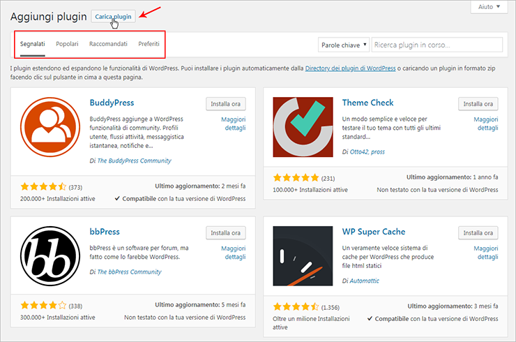• fare una ricerca tra i plugin e trovare quello che si desidera. I filtri di ricerca sono riportati nel menù in alto e permettono di selezionare tra: Segnalati, Popolari, Raccomandati, Preferiti;