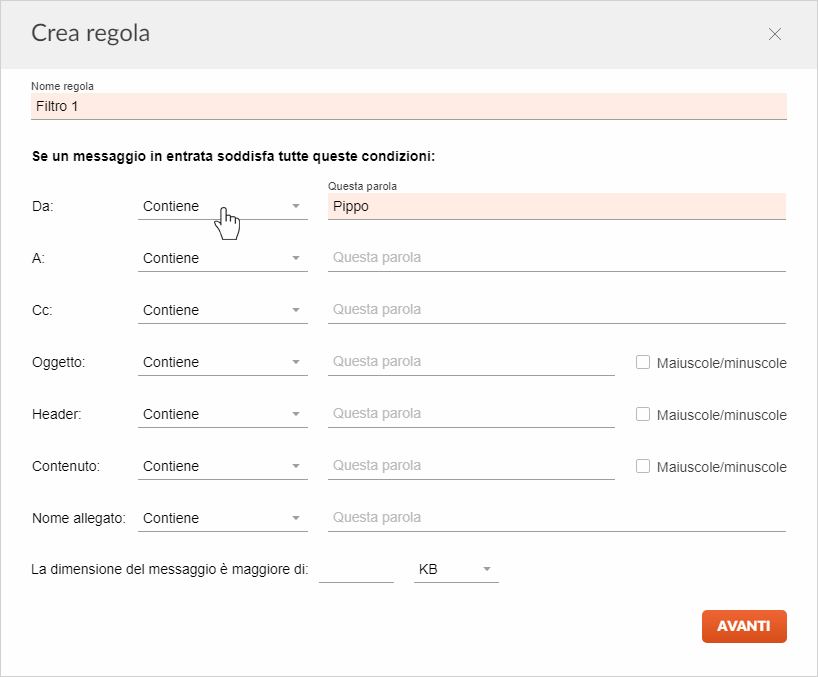 Dopo aver dato un nome alla regola, scegli quali elementi devono avere i messaggi da gestire. Vediamo due esempi: